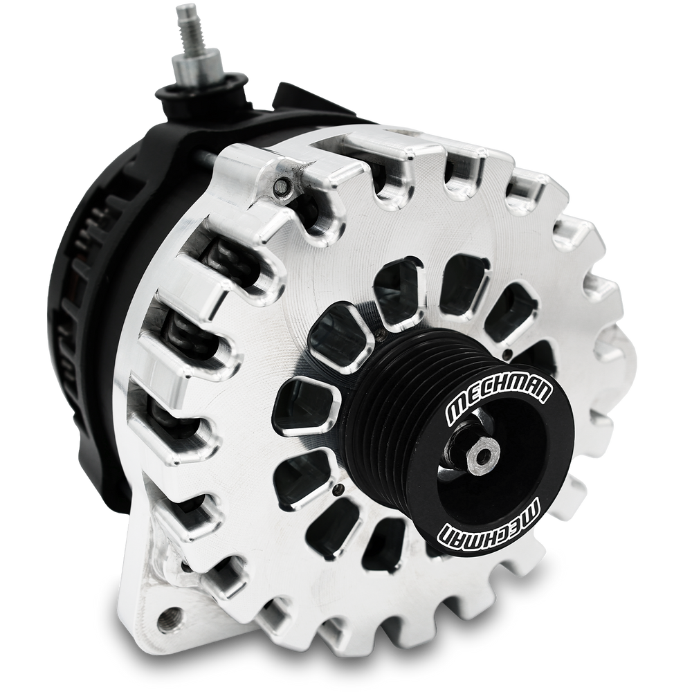 This unit comes equipped with a smaller 1.75-inch diameter alternator pulley and will require a slightly shorter drive belt for proper belt tension. Not recommended for sustained use above 5,000 RPM engine speed. If a larger pulley is required, please reach out to Mechman’s support team and we can work to get you an underdrive pulley to meet your RPM demands.
