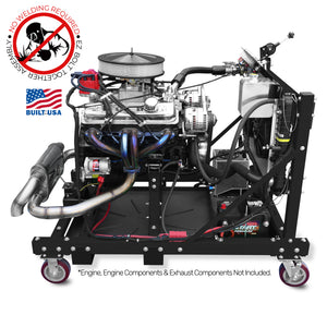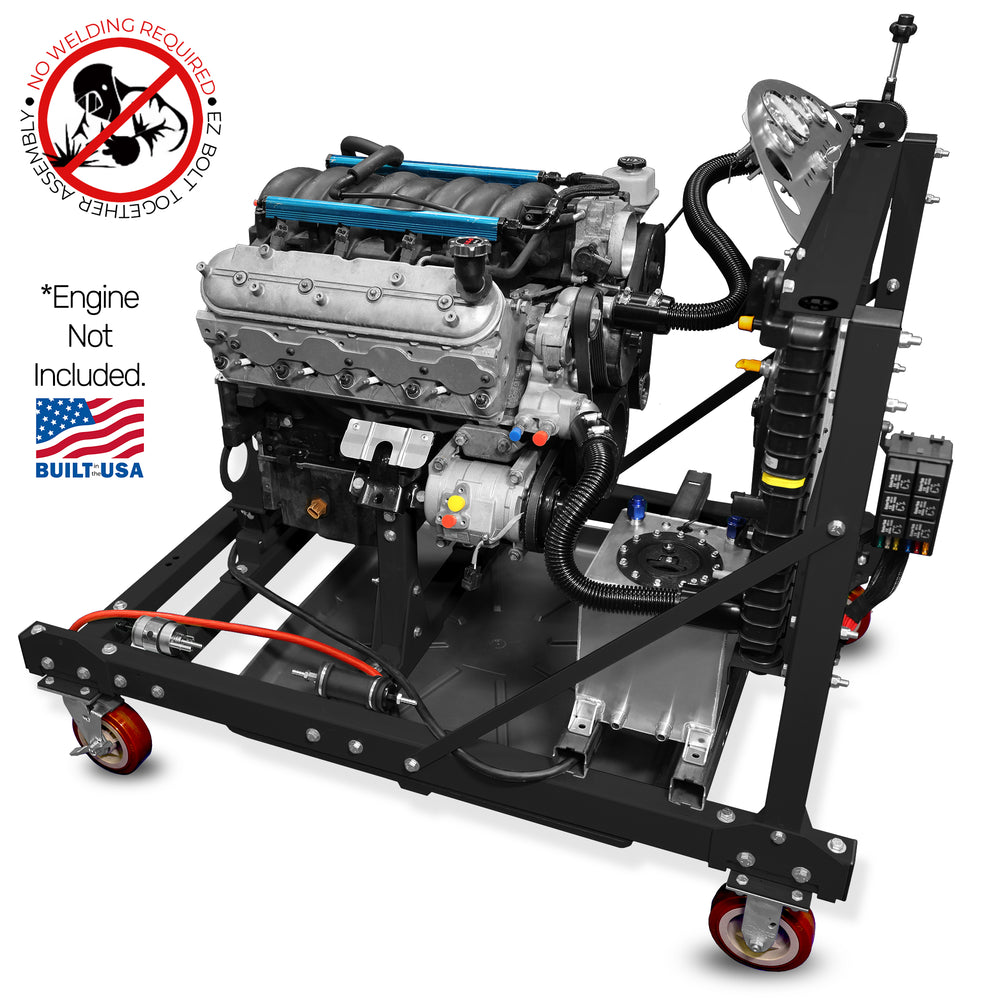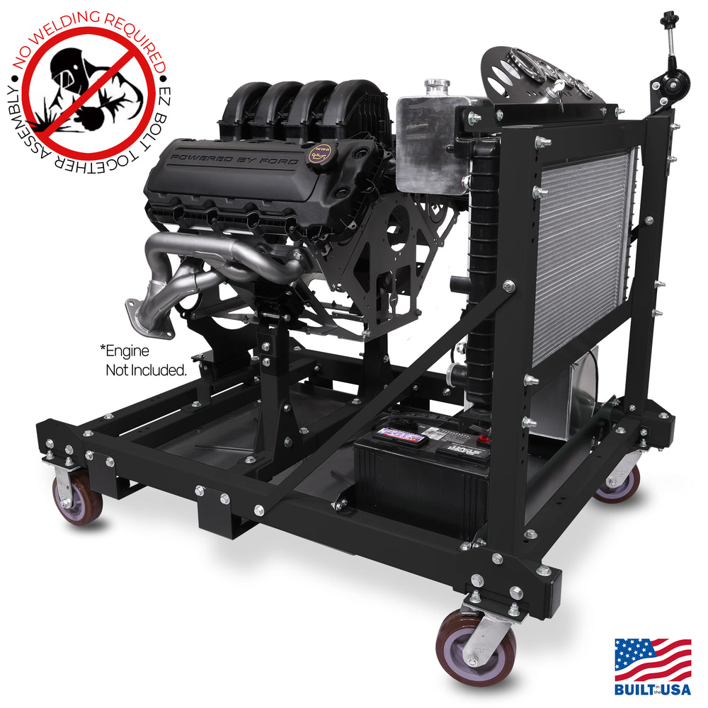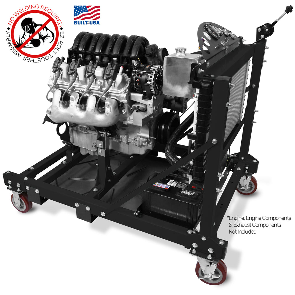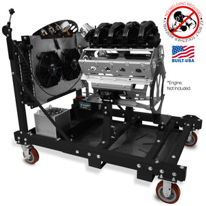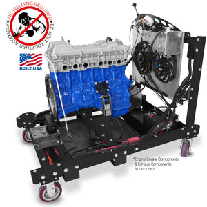 The MechMan Professional Series Running Engine Stand – ATW (All The Way) Kit is a complete engine run stand package built for professionals and enthusiasts who need a dependable platform for test-running engines outside of the vehicle. This product supports one of seven specific engine types: GM LS, GM LT, GM SBC/BBC, Ford Small Block (SBF), Ford Coyote 5.0L, Ford Godzilla 7.3L, or Toyota 2JZ/1JZ. Each stand includes engine-specific mounting hardware and comes with a full set of accessory kits including a fuel system, electrical panel with ignition and starter control, cooling system with radiator and fan, drip tray, and throttle control setup. These components are included with every ATW kit and are designed to support a wide range of user setups, though some adjustment or modification may be necessary depending on the specific engine build and components used.
