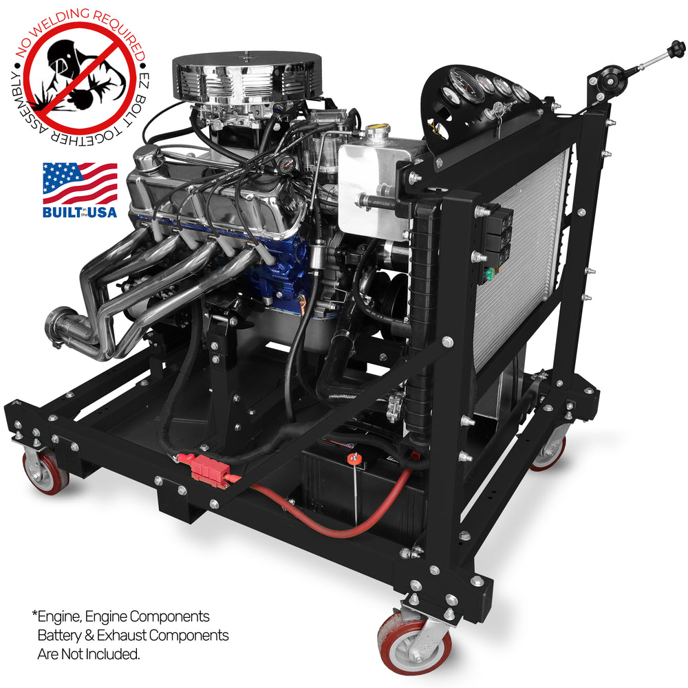This heavy-duty, professional-grade engine test and transport stand is designed to handle even the most demanding engine setups. Built with a rugged, high-strength steel frame, it’s equipped with a bell-housing mid-plate, transmission mount, rubber engine mounts, radiator mounts, and HD locking casters for maximum stability and maneuverability.