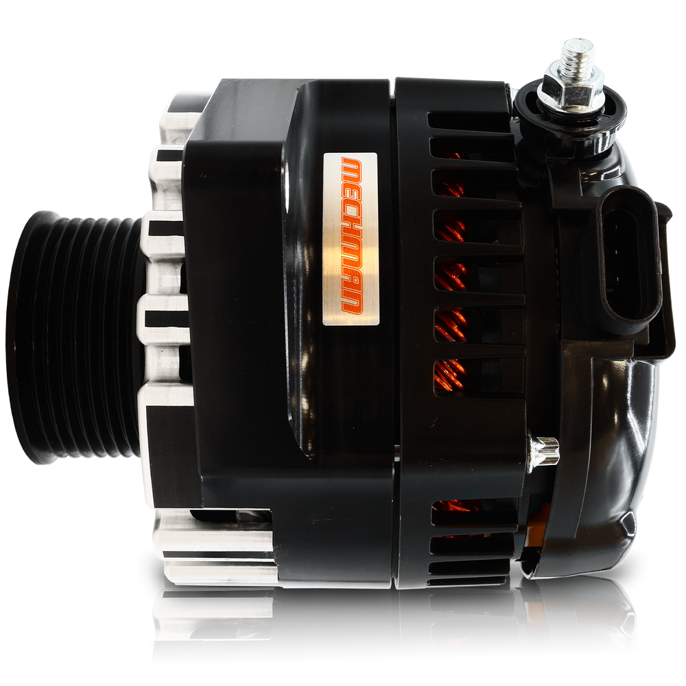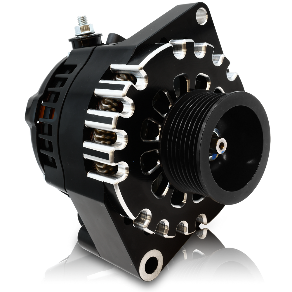 The S series of 6 phase alternators offers incredible output in a compact and durable package. Highly efficient, these units use less horsepower than conventional 3 phase alternators. 12 diodes, twin rectifier plates and outstanding airflow ensure long service life, even in severe conditions. This unit features an OEM 2.6" diamter pulley, making it great for racing applications using the stock diamter crankshaft pulley. If changes have been made to the diamter of the crankshaft pulley on the engine, please contact a sales associate for assistance with calculating pulley ratio.